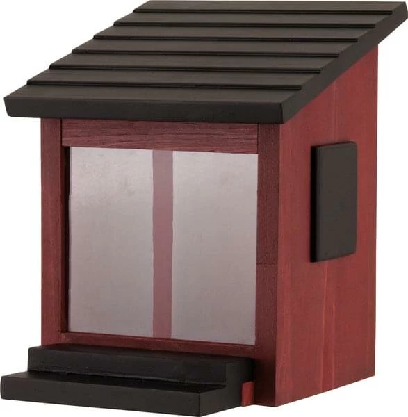 De Ekorrmatare, ofwel het eekhoorn kastje is gevuld met noten en zaden die voor de eekhoorn zichtbaar opgeslagen liggen achter grote ramen aan de voorkant. De Eekhoorn zit op de uitstekende houten veranda en gebruikt z‰€ªn hoofd om het dak op te lichten om bij het voedsel te komen. Eekhoorns zijn intelligente dieren en leren snel hoe zij bij allerhande lekkernijen kunnen komen, hoe moeilijk dat soms ook lijkt te zijn. Het dak sluit weer op het moment dat de Eekhoorn klaar is met eten zodat andere dieren en vogels niet bij het voer kunnen. De Ekorrmatare is gemaakt van massief weerbestendig hout en is voorzien van een ophangblok voor montage tegen een muur of boom.
