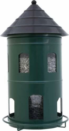 Met dit grote voederhuis kun je vele vogels voorzien van eten. Het voederhuis heeft namelijk een inhoud van wel 6 liter! Het voederhuis bevat meerdere voerdispensers waardoor er meerdere vogels tegelijk van het voer kunnen eten. De dispenser is zo ontworpen dat ondeugende vogels het voer niet kunnen verspreiden en grote vogels niet bij het voer kunnen zodat de kleine vogels een betere kans hebben om rustig te eten. Dit grote voederhuis kan met de bijgeleverde schroef gemonteerd worden op een paal. Het artikel is gemaakt van waterdicht gepoedercoat staal en de container is gemaakt van recyclebaar PC kunststof. Het voederhuis kan eenvoudig bijgevuld worden. Een onmisbaar item in de tuin van een liefhebber van vogels. Wat zal het genieten zijn om te kijken naar al die vogels die afkomen op het voer!Â