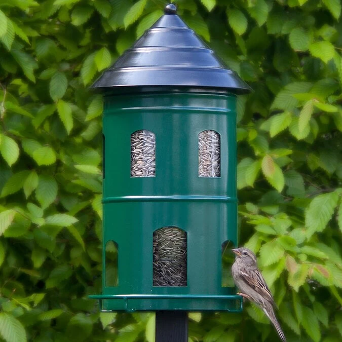Met dit grote voederhuis kun je vele vogels voorzien van eten. Het voederhuis heeft namelijk een inhoud van wel 6 liter! Het voederhuis bevat meerdere voerdispensers waardoor er meerdere vogels tegelijk van het voer kunnen eten. De dispenser is zo ontworpen dat ondeugende vogels het voer niet kunnen verspreiden en grote vogels niet bij het voer kunnen zodat de kleine vogels een betere kans hebben om rustig te eten. Dit grote voederhuis kan met de bijgeleverde schroef gemonteerd worden op een paal. Het artikel is gemaakt van waterdicht gepoedercoat staal en de container is gemaakt van recyclebaar PC kunststof. Het voederhuis kan eenvoudig bijgevuld worden. Een onmisbaar item in de tuin van een liefhebber van vogels. Wat zal het genieten zijn om te kijken naar al die vogels die afkomen op het voer!Â