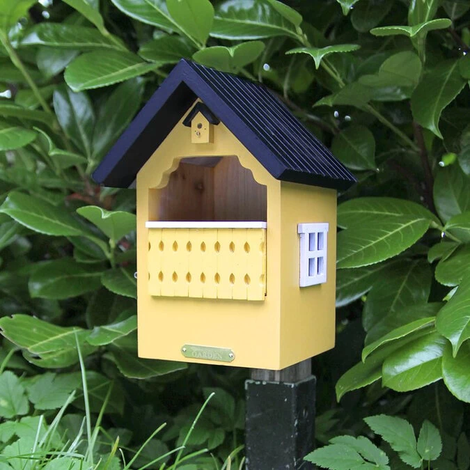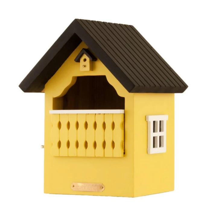 Geel nestkastje in de vorm van een huis met een balkon. Verkrijgbaar in drie verschillende kleuren: rood, wit en geel. Wordt geleverd inclusief schroeven en montageblok.
