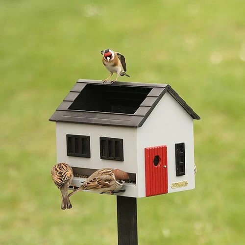 Voederhuisje van Wildlife Garden met grappige details zoals een voordeur, ramen en een balkonnetje. In het huisje kun je voer stoppen en het bad bevindt zich in het dak. Het voer is eenvoudig bij te vullen via het dak. Aan de zijkant van dit voederhuis zitten beugeltjes waar de vogels rustig op kunnen gaan zitten terwijl ze eten. Je kunt het voederhuisje plaatsen op een Wildlife Garden paal. Deze is verkrijgbaar in de kleuren zwart en blank hout. De paal wordt niet standaard meegeleverd.